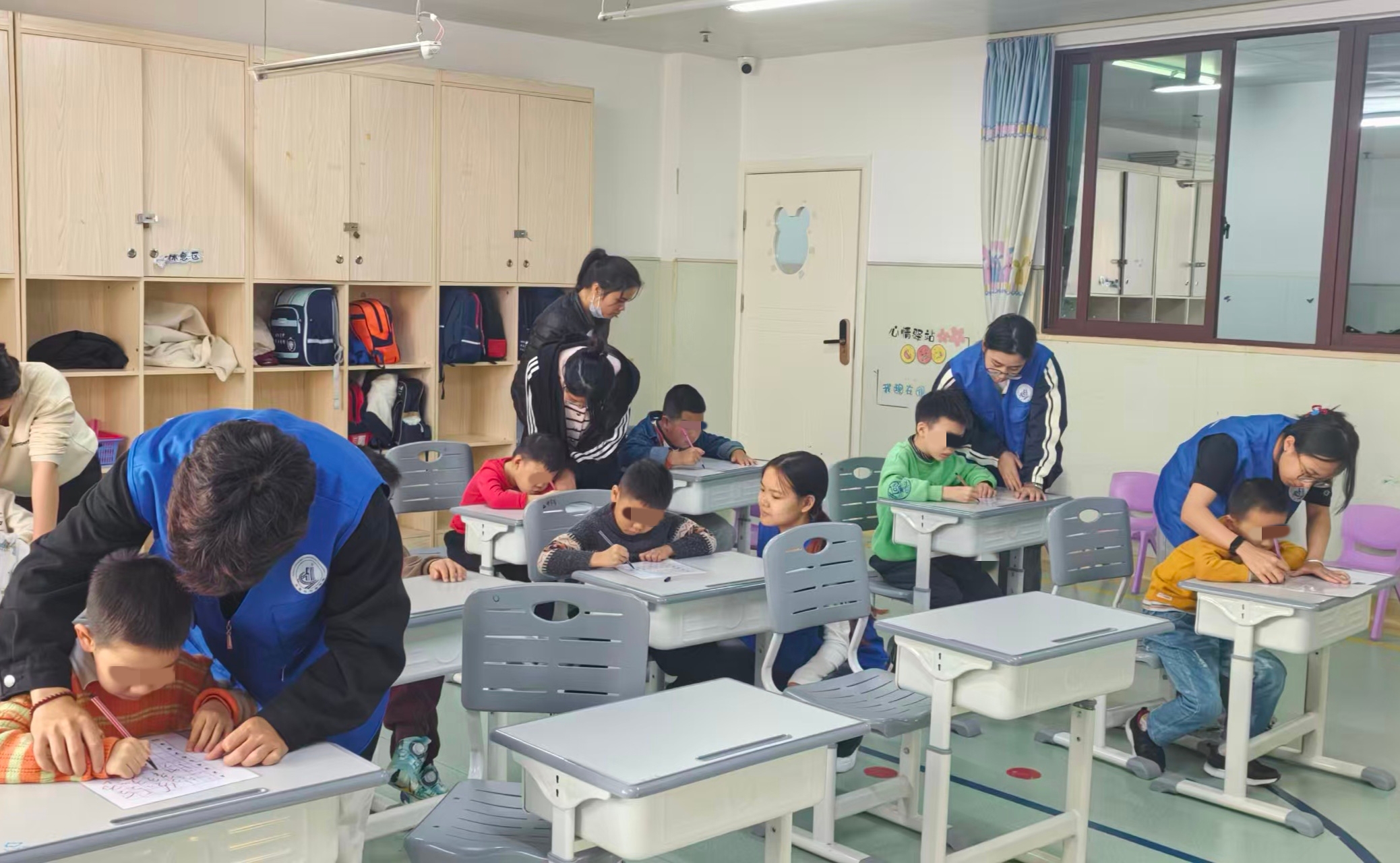 图为志愿者们在辅助小朋友们写字