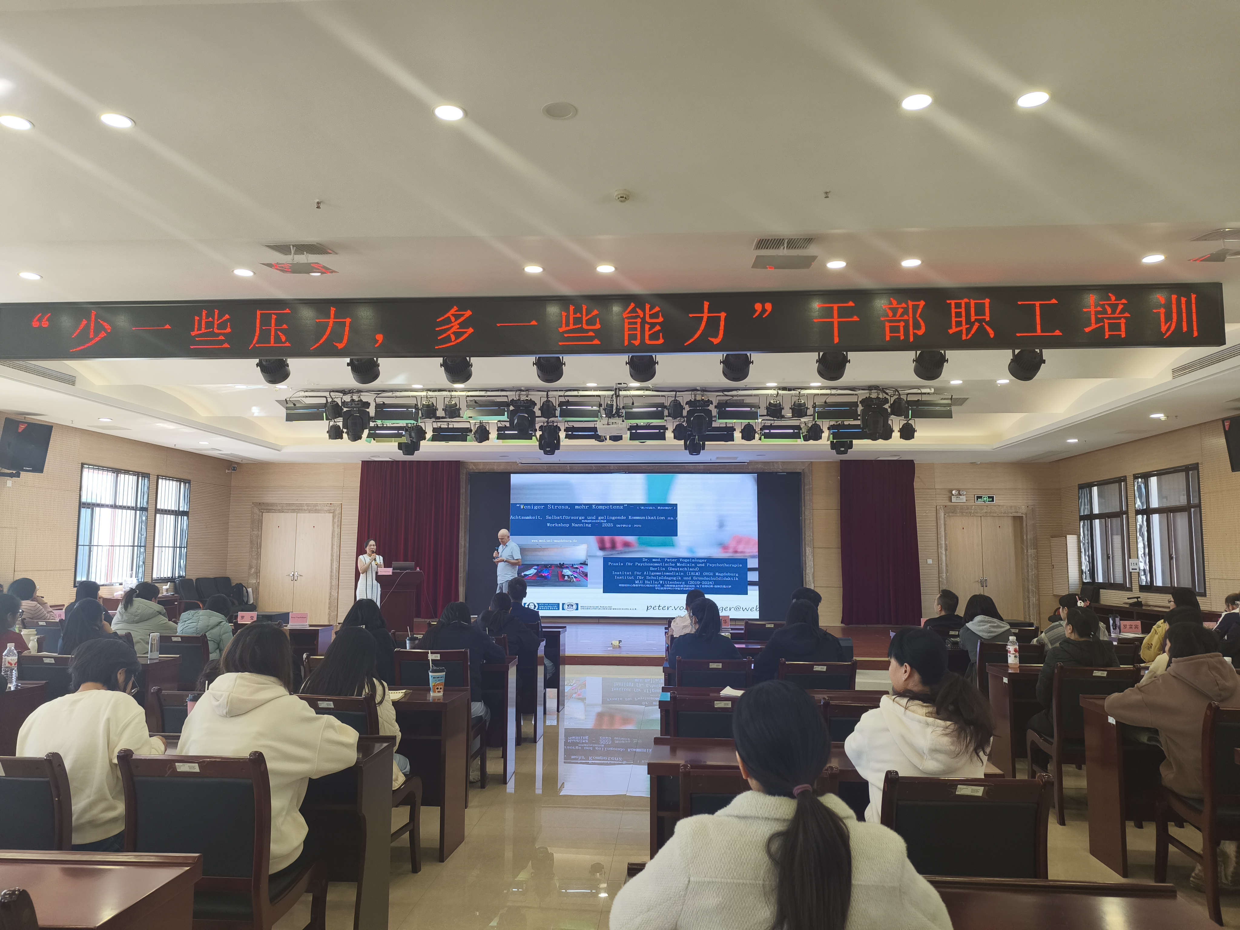 为切实缓解干部职工身心压力,提升心理调适能力,2025年11月20日下午,自治区残疾人康复研究中心邀请彼得·沃格尔辛格博士与罗莹老师,为全体干部职工开展了以“少一些压力,多一些能力”为主题的培训活动。共有50余名职工积极参与,现场气氛热烈。