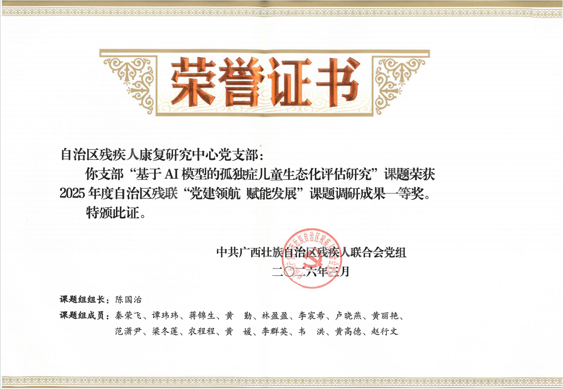 此次获奖课题为“基于AI模型的孤独症儿童生态化评估研究”。该课题聚焦孤独症儿童康复评估的难点,引入人工智能技术,致力于提升康复干预的科学性、精准性与个性化水平。这一课题正是中心落实广西科技助残部署的具体成果,后续将推动AI评估模型在基层康复服务中落地应用,切实提升康复服务的可及性与精准度,增进孤独症儿童及其家庭福祉。