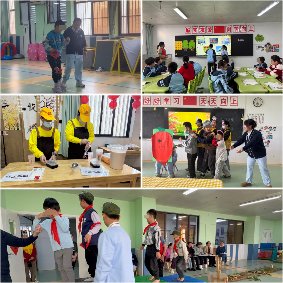各参赛班级依次进行教学展示。融合三班开展《轮滑》体适能课,依据学生能力差异分层设计任务;赋能班带来《拍手歌》课程,结合律动与游戏,引导学生在愉悦中学习;融合二班以《小红军送信》为主题,融入故事、图像与歌曲,开展形式多样的体能活动;融合一班呈现情景音乐课《拔萝卜》,巧妙融合叙事与康复训练环节;职业康复班则展示《生活适应——社区活动》课程,将课堂延伸至真实生活场景,注重学生社会适应能力的培养。