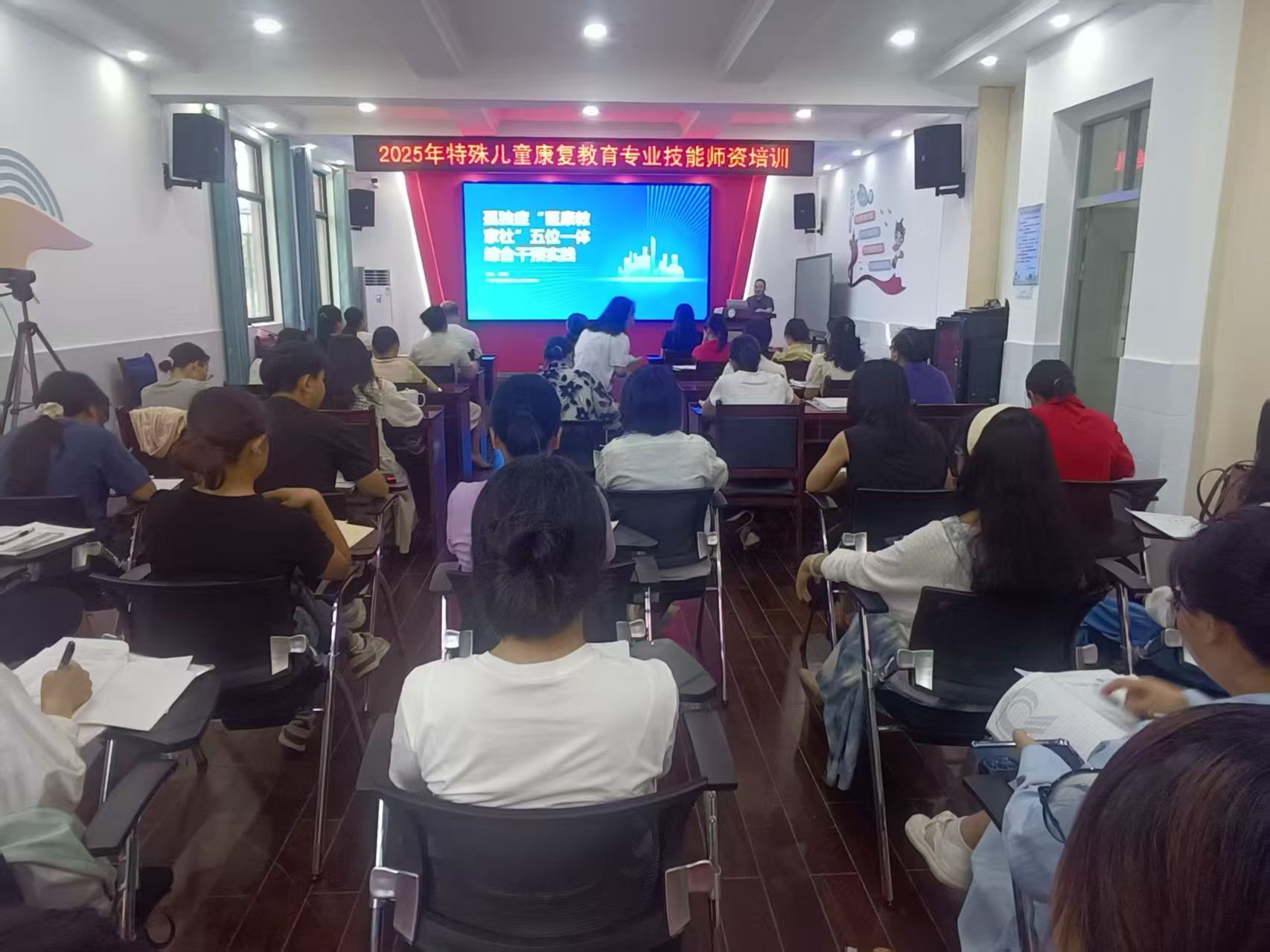 活动中,中心副主任蒋锦生作《孤独症儿童医康教家社康复模式探索》专题讲座,阐释多维度干预体系。康复教育科科长蒙爱珍与骨干教师葛婷婷分别开展个别化教育计划书写及班级目标统整专题培训,指导参训教师将康复训练与日常教学相结合。