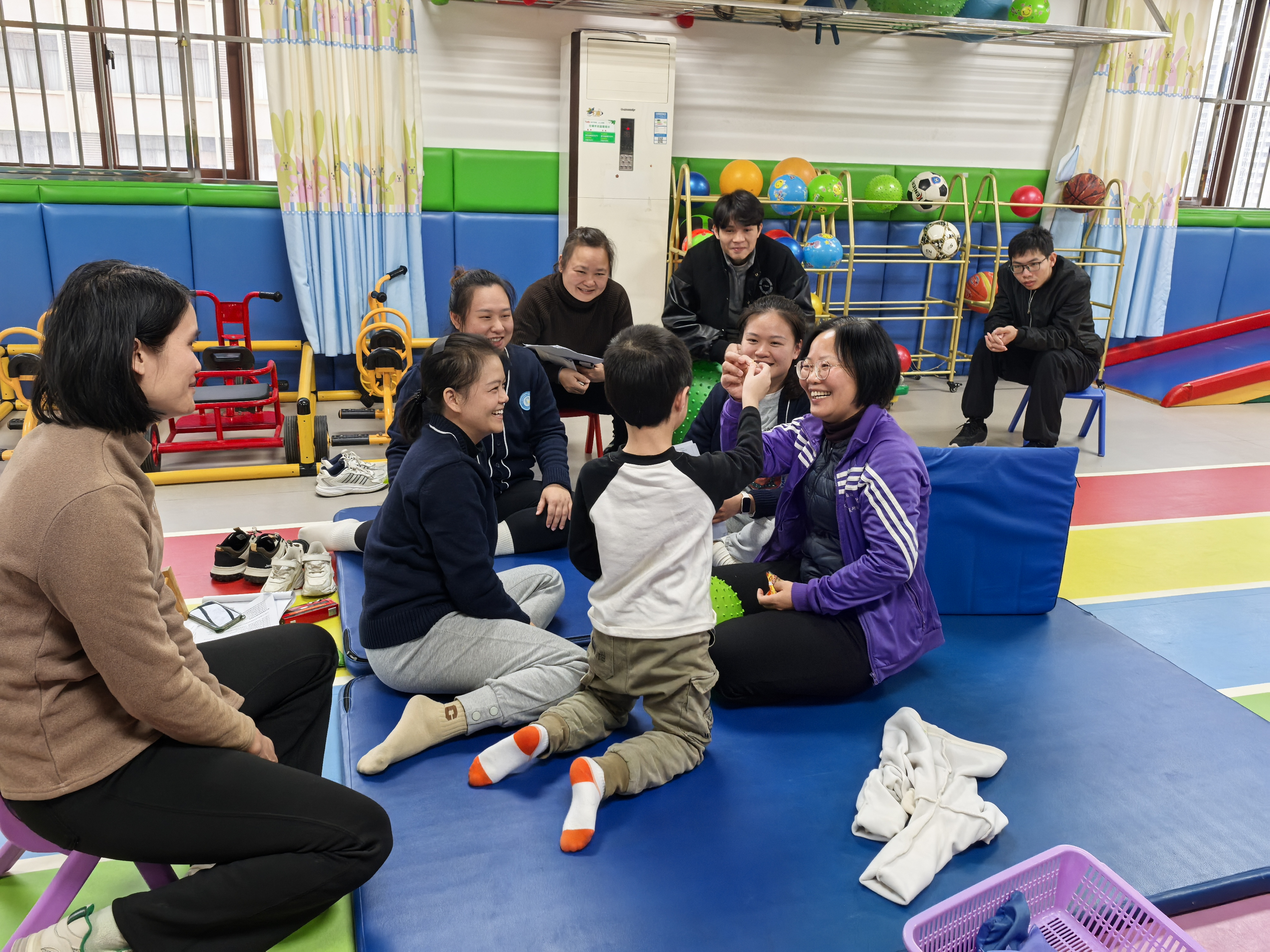 在本次实操培训中,康复教育科科长蒙爱珍带领科室康复教师通过分组实操的形式,为在训残疾儿童进行个案评估及家长康复指导。康复教师根据评估结果,为个案拟定接下来的训练重点和方向,指导家长开展课后练习。