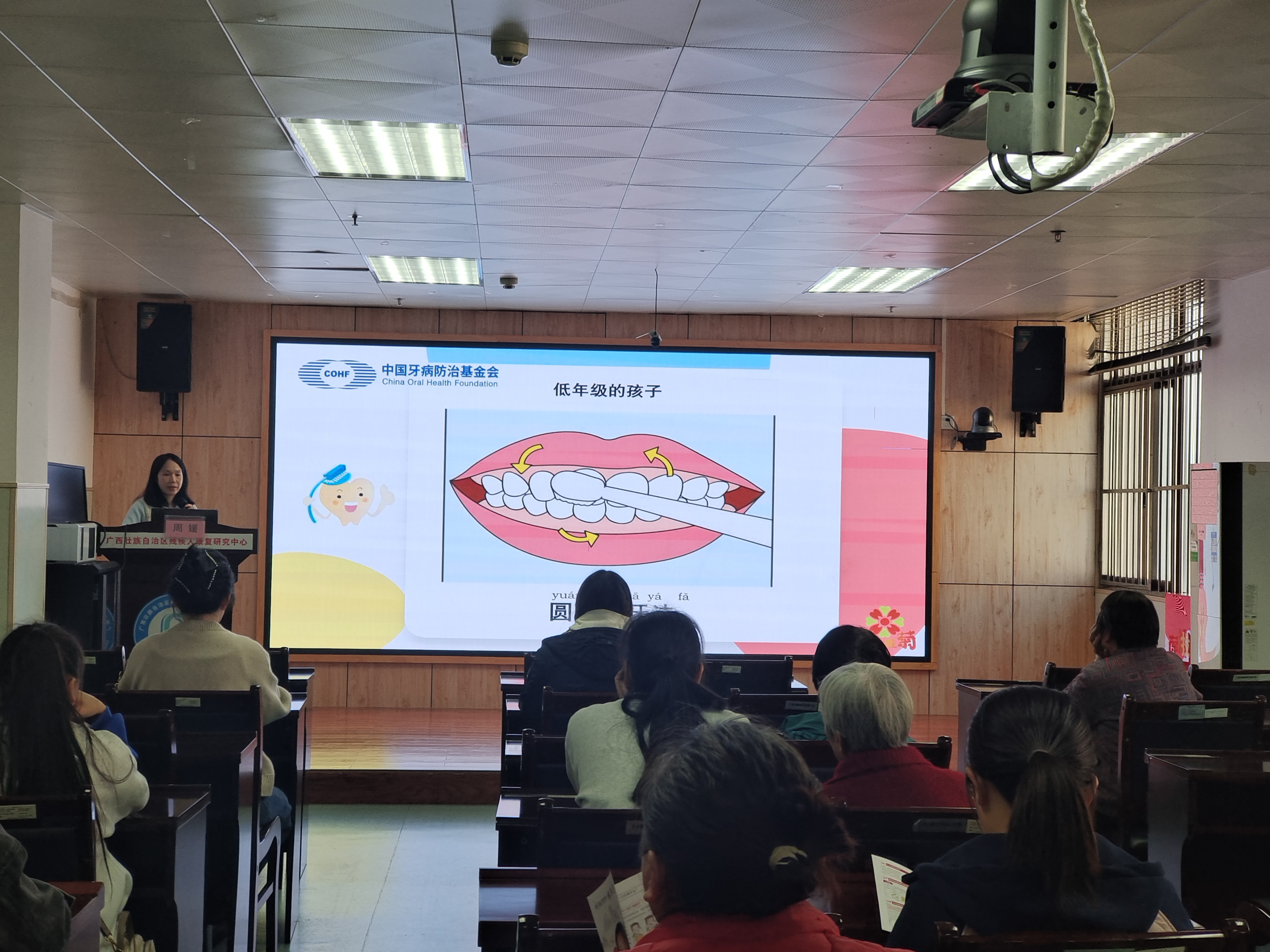 本次义诊邀请广西中医药大学附属瑞康医院主治医师周媛开展《儿童口腔问题家长应对策略》专题讲座。周媛从儿童龋齿成因、儿童圆弧刷牙法及成人巴氏刷牙法三方面展开讲解,结合特殊儿童行为特点,现场指导护牙技能。