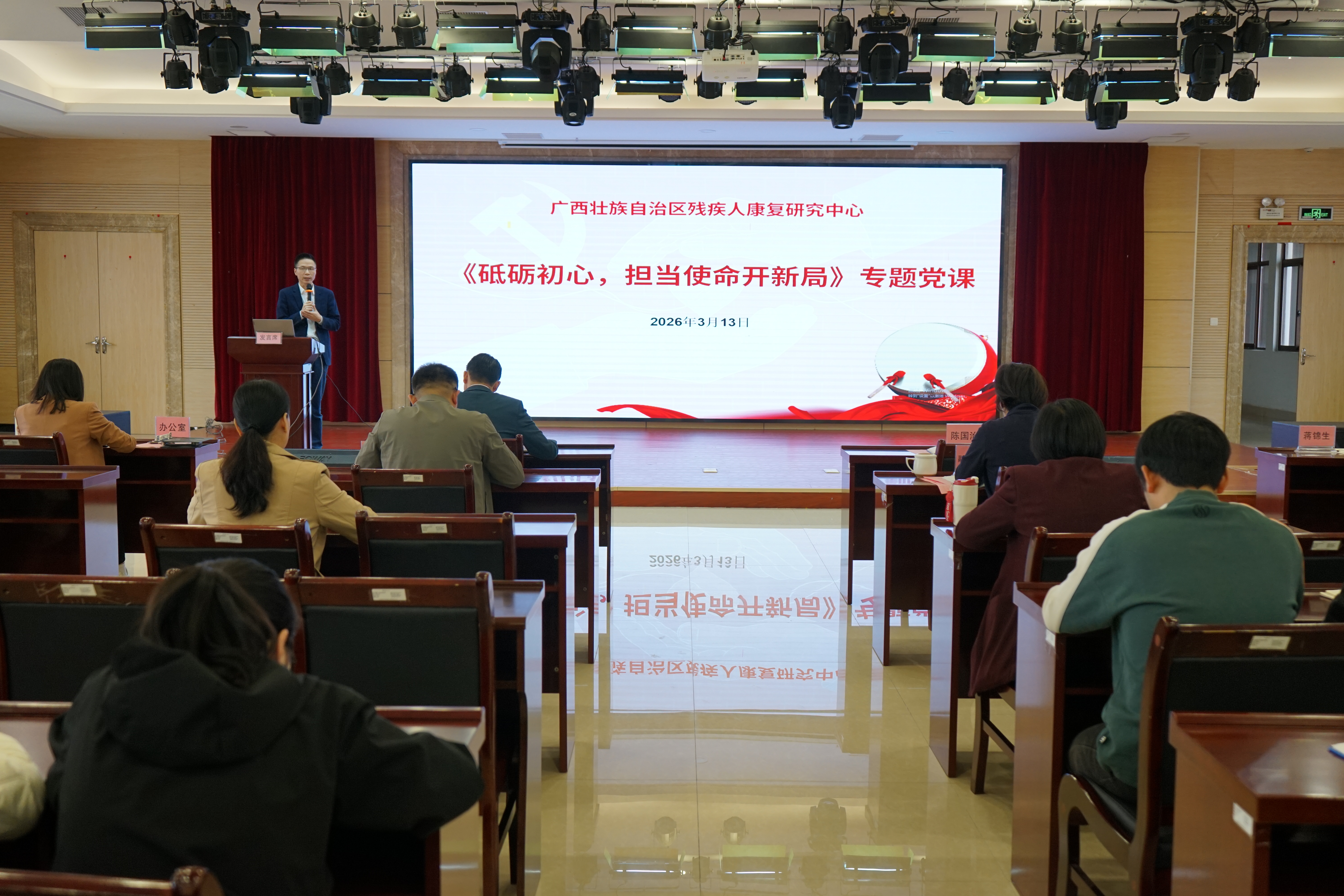 2026年3月13日下午,自治区残疾人康复研究中心召开2026年度工作会议、“砥砺初心 担当使命开新局”专题党课。中心党支部书记、主任陈国治讲授专题党课,全面总结2025年工作成效,深入分析存在问题,系统部署2026年重点任务。党支部副书记、副主任秦荣飞主持,全体干部职工参加。