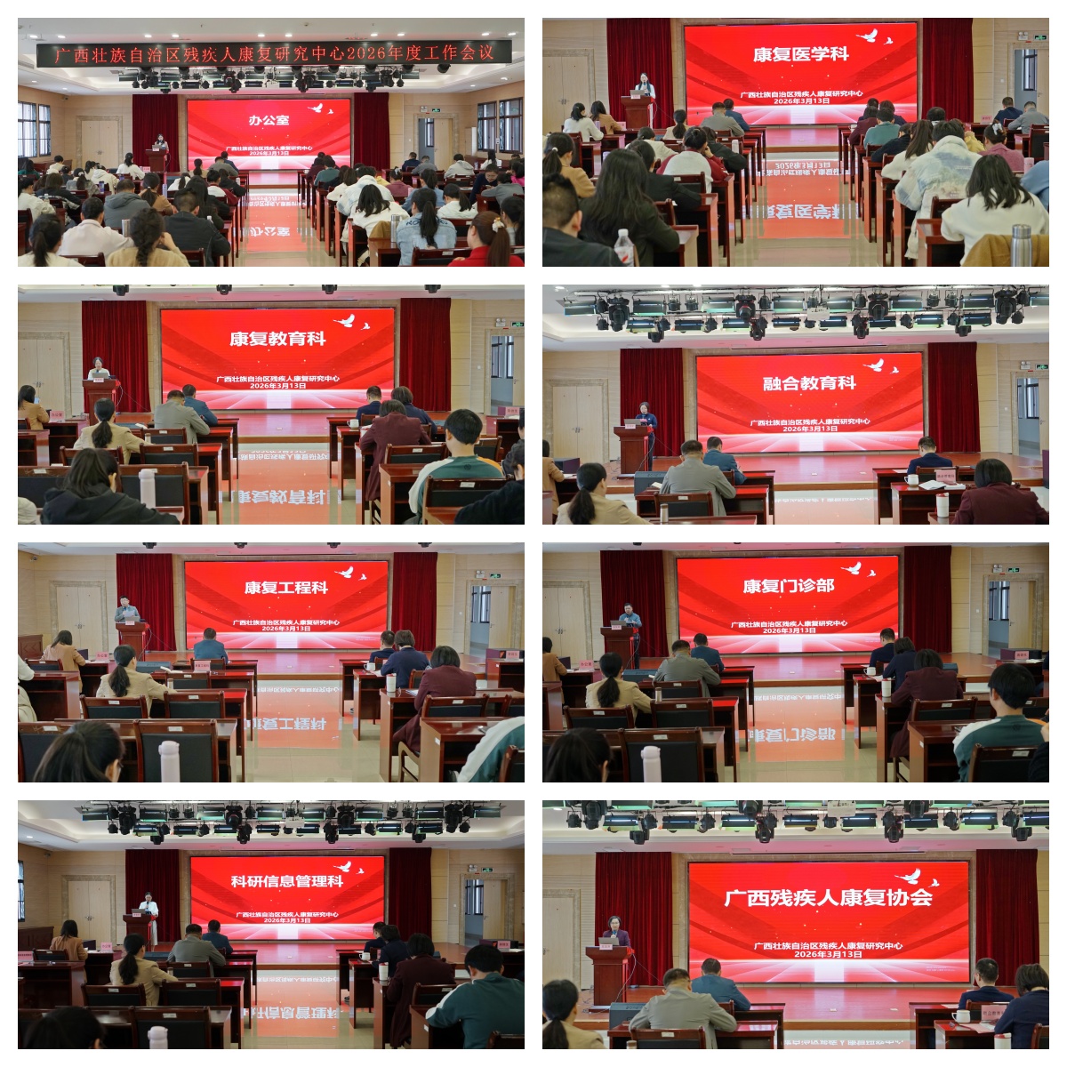 会议还安排了科室工作汇报环节,办公室、康复医学科、康复教育科、融合教育科、康复工程科、康复门诊部、科研信息管理科和广西残疾人康复协会分别做了工作汇报。