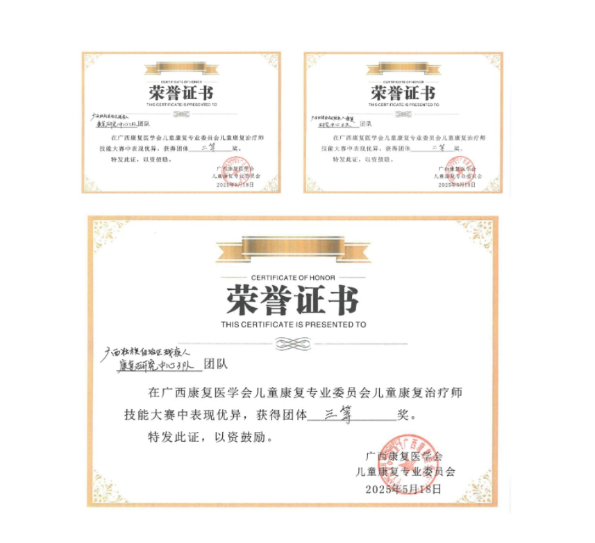 在2025年5月14日至18日举办的广西康复医学会儿童康复专业委员会儿童康复治疗师技能大赛中,自治区残疾人康复研究中心参赛队伍表现优异,荣获多项大奖。